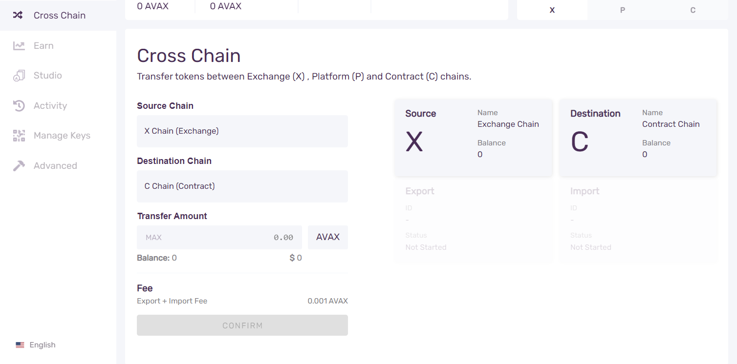 Exchange Chain (X Chain) used for receiving funds; note the address changes after each deposit so don’t whitelist or save addresses when transferring off exchanges. Whilst it’s main function as a subnet is the creation of new assets we are utilising it as the first stage to bridge our assets.