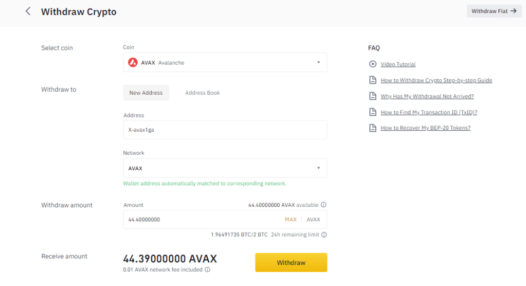- Enter your MetaMask wallet address by copying and pasting it into the “To Address” field on your Avalanche wallet.
