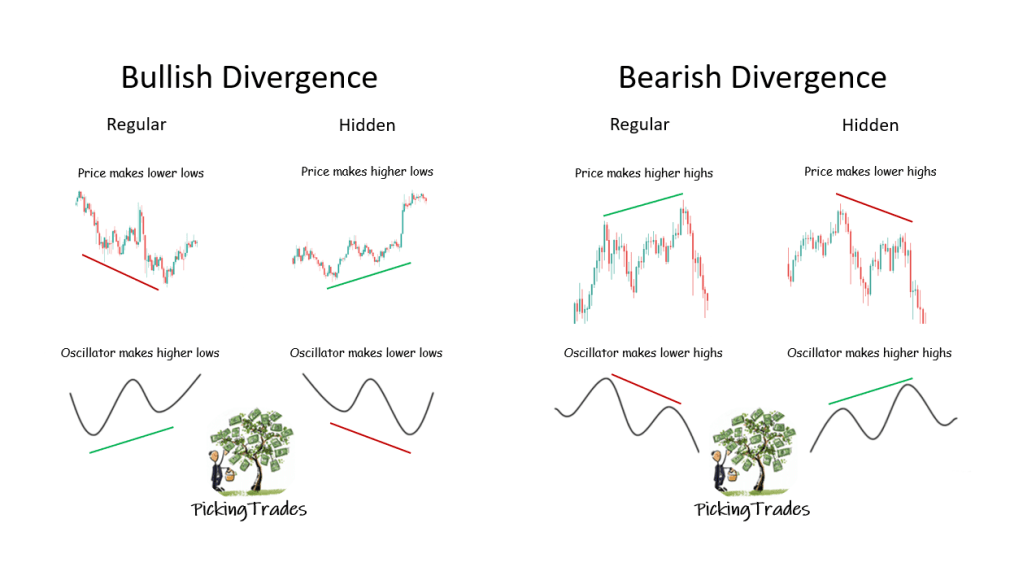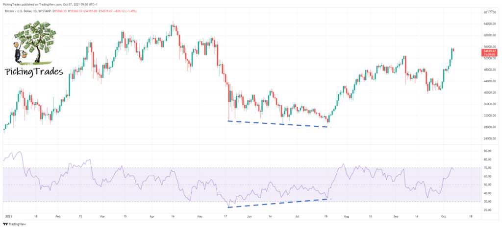 When conflicting information can be identified on a chart in combination to an oscillator they are called Divergences. These are simply areas where information seems to conflict across the 2. Below I have high highlighted a regular Bullish Divergence based on the selling extremes identified on the RSI when plotted against those same points and the result on price information. We can see that the lowest price point did not actually produce the most extreme RSI reading.